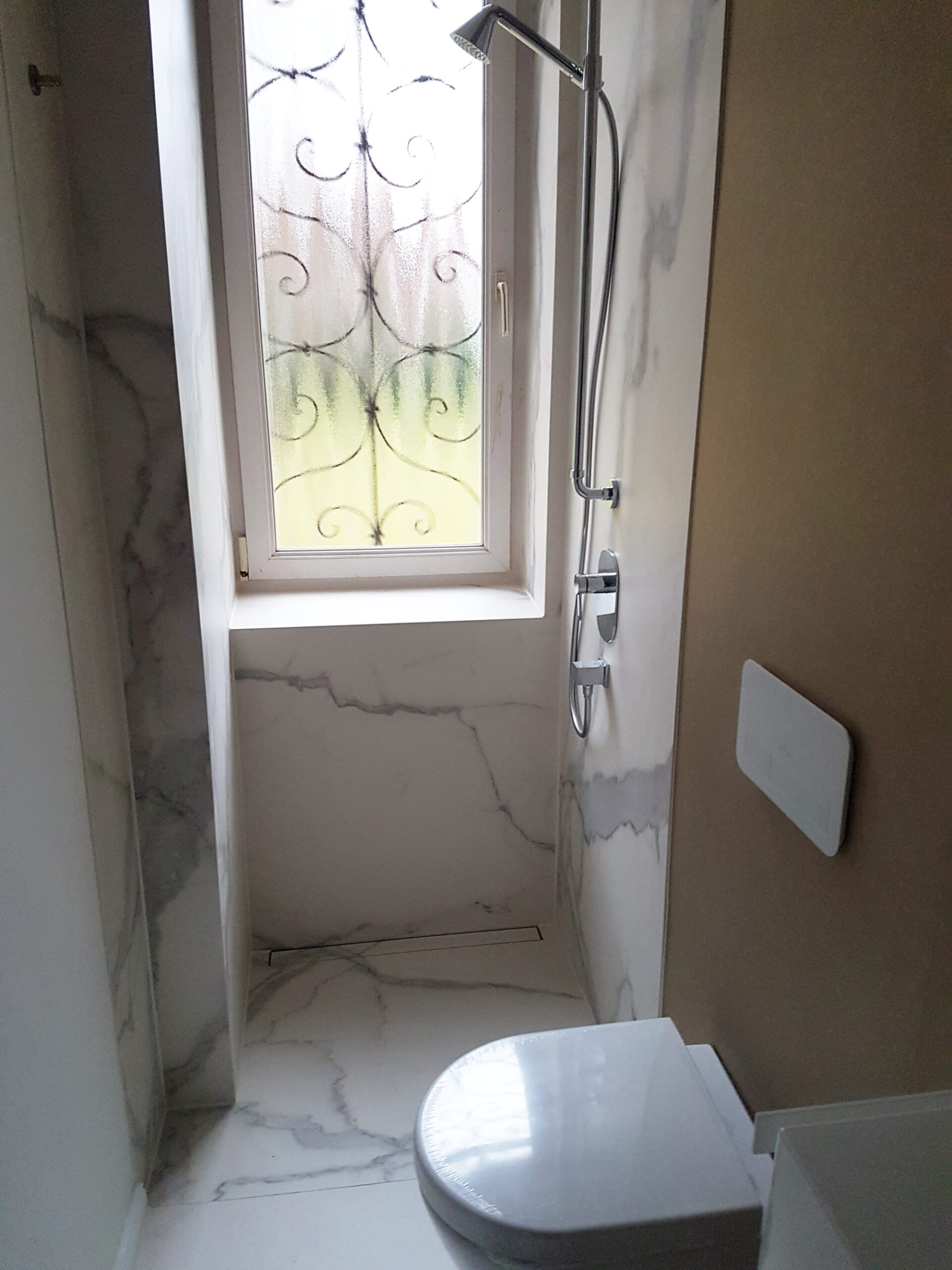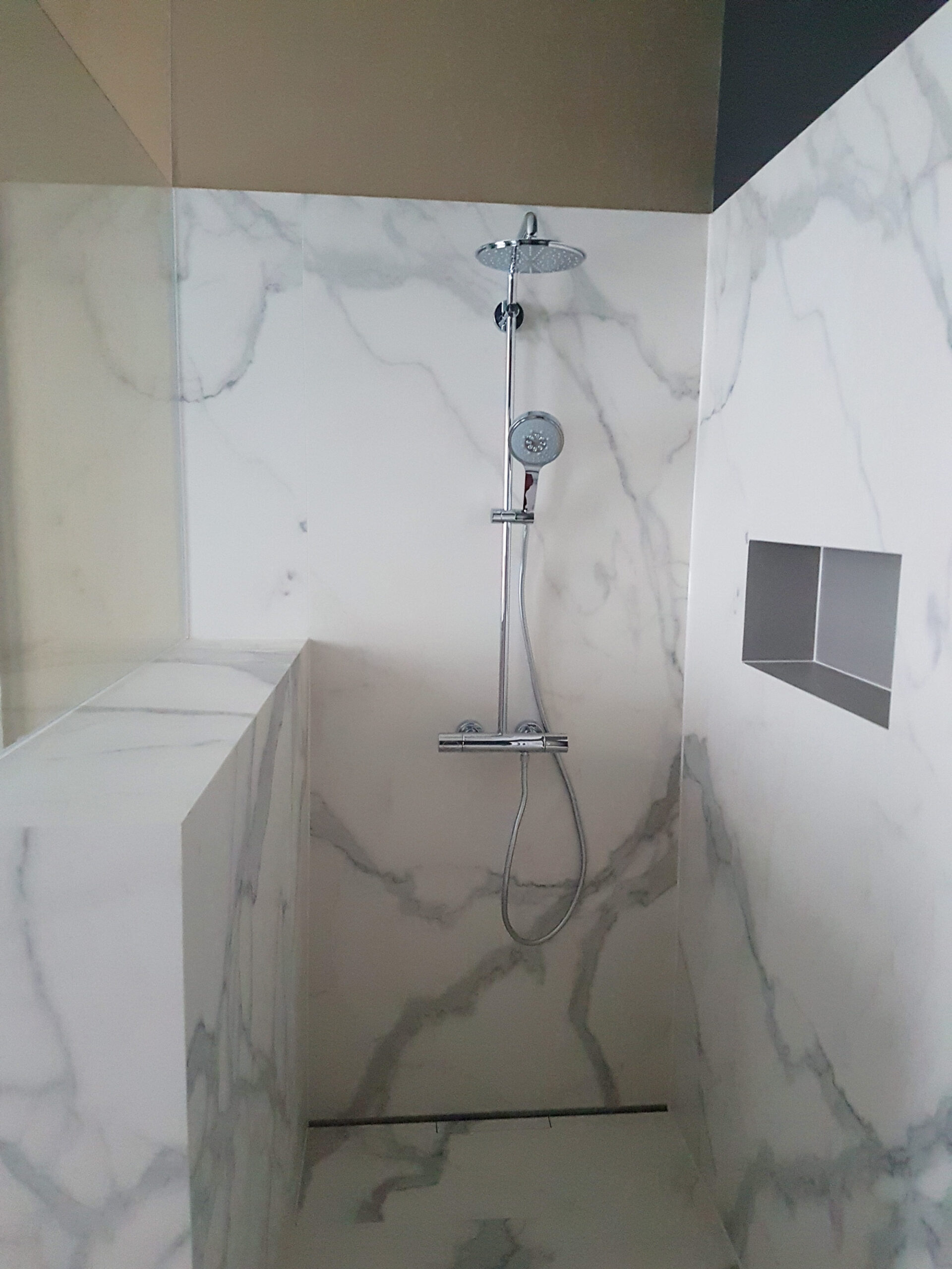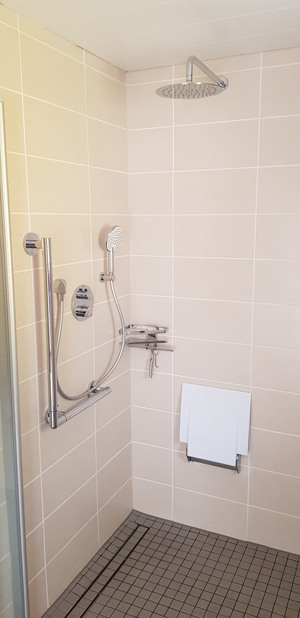 Die neue Dusche ist bodennah ausgeführt. Der Einstieg ist komfortabel und sicher. Der Raum wirkt offener und funktionaler. Die Lösung verbessert die Nutzung, ohne den Grundriss zu verändern.