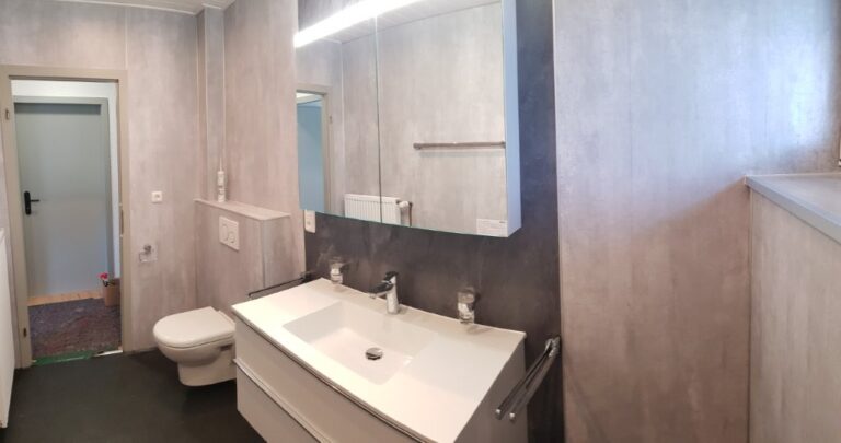 Der Raum zeigt sich modern und klar. Fugenlose Oberflächen in Betonoptik ersetzen Fliesen. Ruhige Flächen schaffen Ordnung und Weite. Das Bad wirkt zeitgemäß, pflegeleicht und hochwertig.