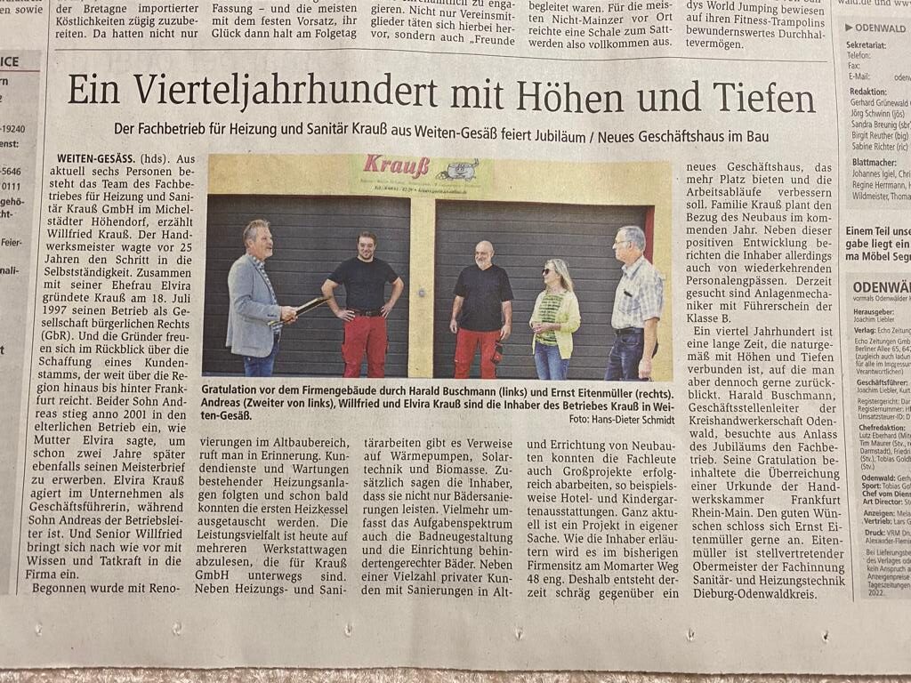 Vor einem Vierteljahrhundert legte unsere Familie den Grundstein für die Krauß GmbH. Seitdem sind wir mit der Region Odenwald eng verbunden und haben uns einen Namen als zuverlässiger Partner für Heizung, Sanitär und Lüftung gemacht. Was uns antreibt, sind langjährige Kundenbeziehungen: Viele unserer Kunden begleiten wir schon seit Jahren – einige mittlerweile in zweiter Generation.